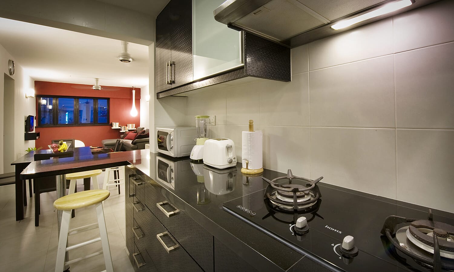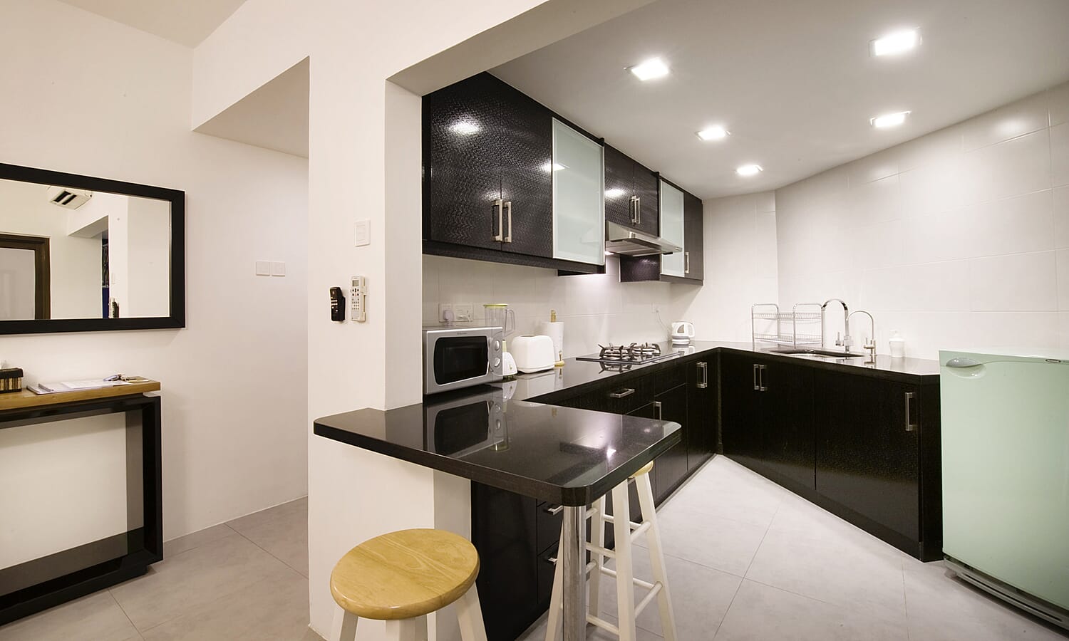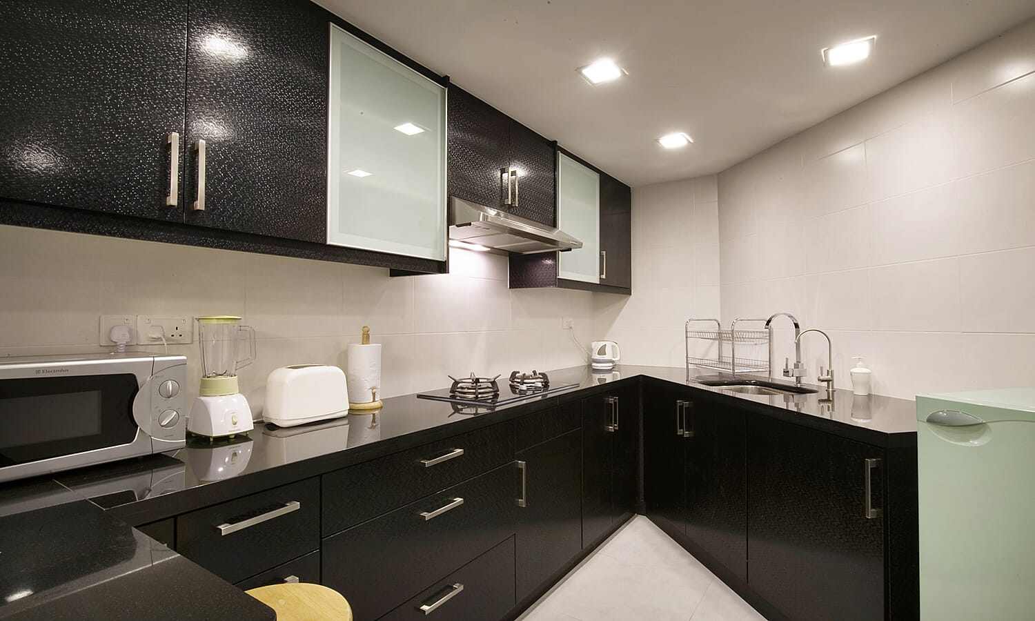 The kitchen has everything you'll need for either a quick snack or a full-blown gourmet dinner. Twin burner gas stove, convection oven, microwave, kettle, blender, toaster, rice cooker. All the utensils, crockery, kitchen knives ad cutlery too. There is even filtered drinking water, so you don't need to buy plastic bottles all the time.