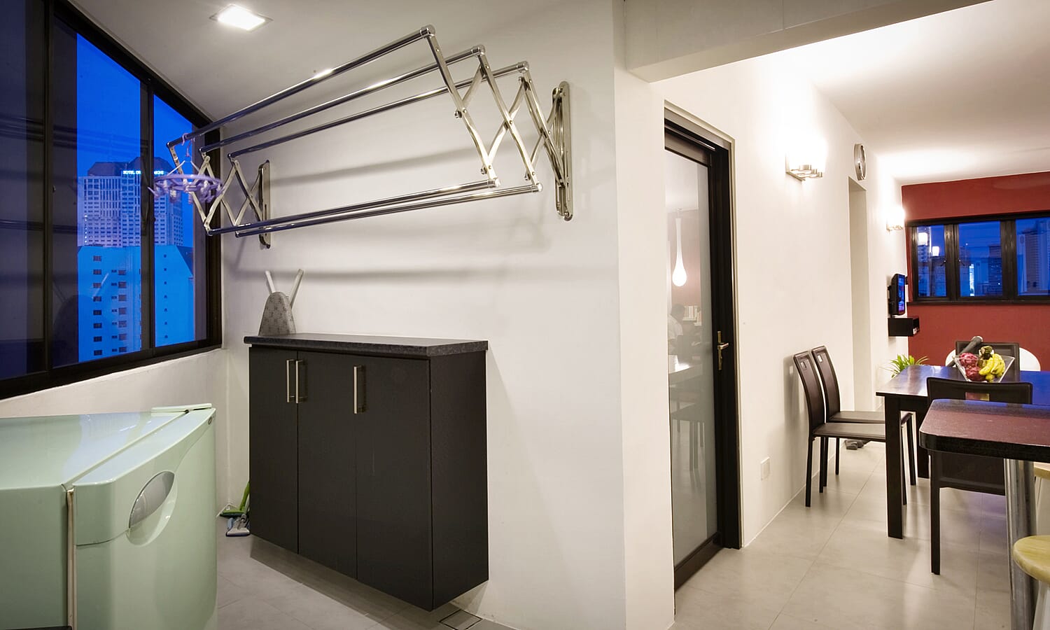 The washing machine is built-in to the kitchen cabinets and there is a big 6-foot 5-bar retractable clothes line for hanging laundry to dry (which can dry within hours in the tropical heat).