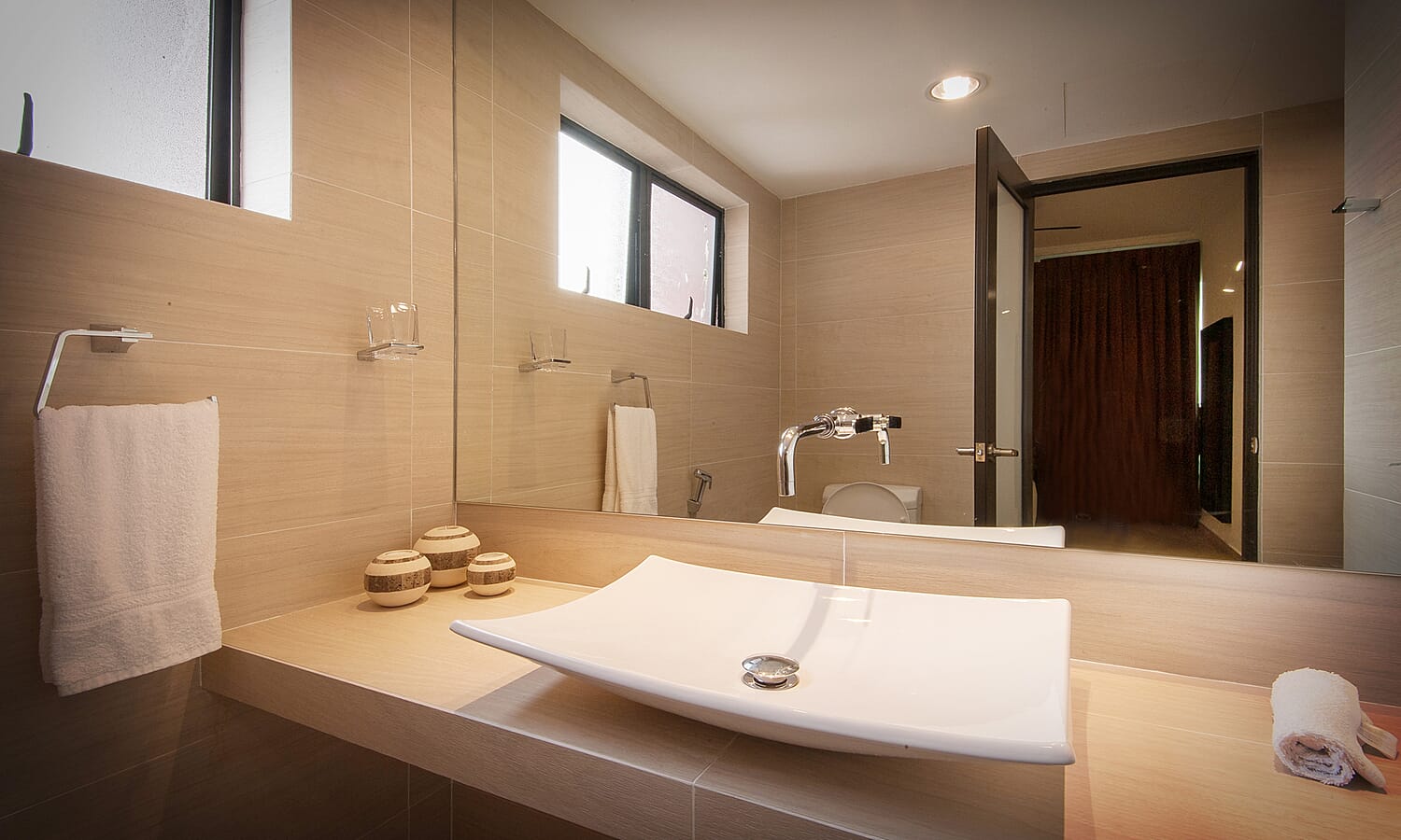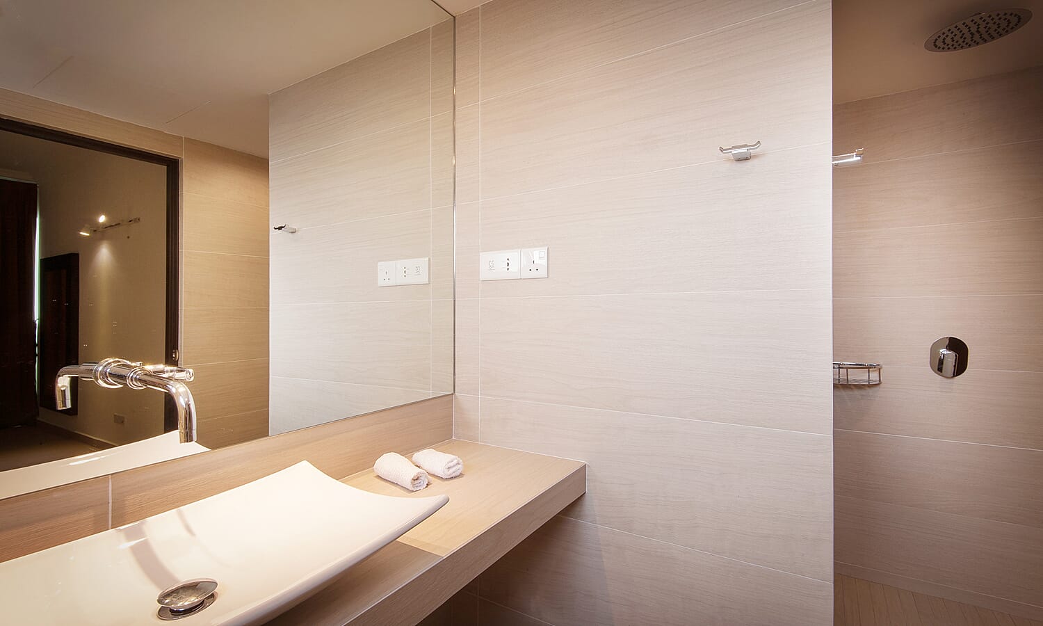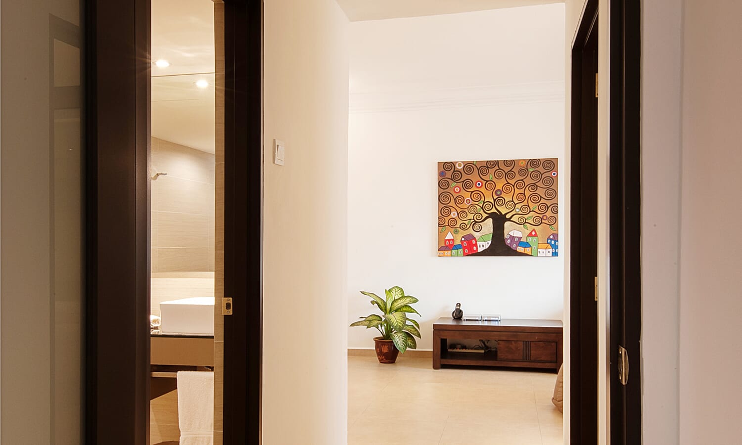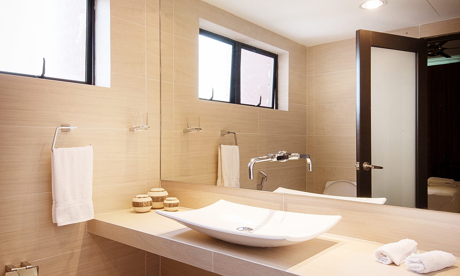 There are 2 bathrooms, tastefully finished with floor to ceiling textured tiles for a spa-like feeling. They have powerful hot showers, large basins, twin-flush toilets and shaver/hair dryer sockets.