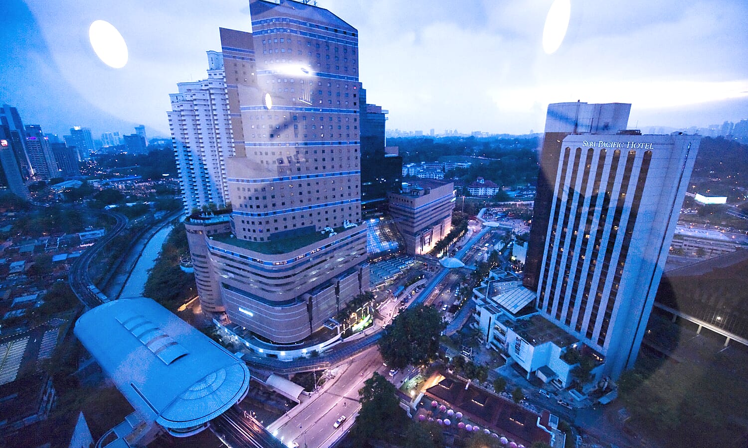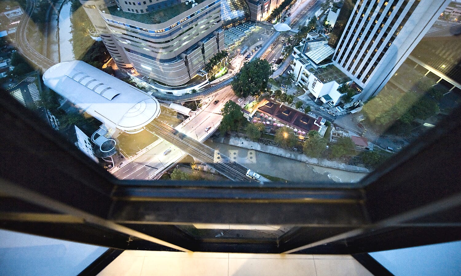 You can see more than 20 kilometres from the window, looking west of the city and down to PWTC train station below and the big Sunway Putra shopping mall.